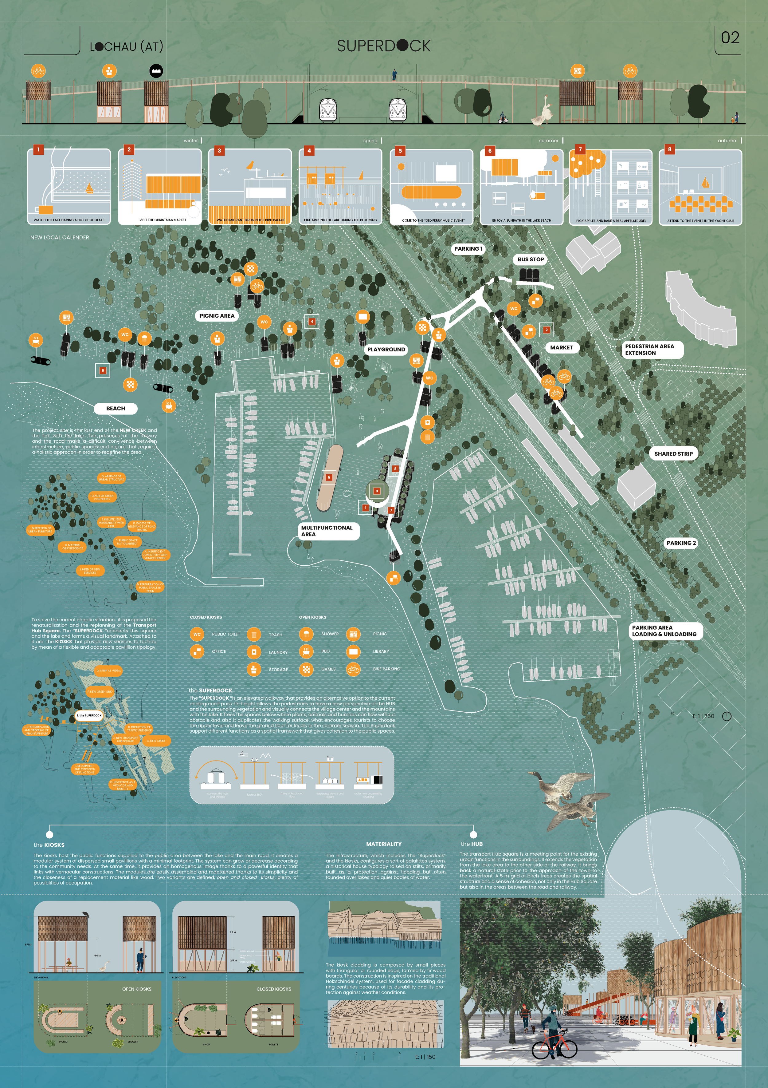 “Superdock” es una intervención que forma parte de un plan urbano integral para el pueblo de Lochau llamado “Slowchau”. Este plan constituye un modelo urbano para el futuro basado en tres principios: la restauración de los corredores naturales, la movilidad lenta y las agrocolonias, una infraestructura comunitaria destinada a la agricultura.